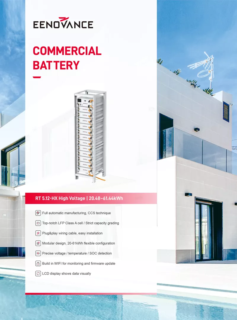 RT 5.12-HX High Voltage Battery System, a flagship product from EENOVANCE, is designed for small-scale commercial and industrial energy storage systems. With a modular capacity of 5.12 kWh, it supports up to 12 battery packs per cluster and a maximum of 4 clusters in parallel. Widely installed globally, it is highly regarded for its reliability and efficiency.